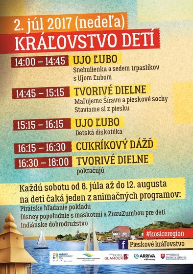 Fantázia je najmä výsadou našich najmenších, ktorí budú mať v Pieskovom kráľovstve aj svoje vlastné Kráľovstvo detí. Už 2. júla ich od 14:00 do 18:00 čaká bohatý program – najväčším ťahákom bude Ujo Ľubo a jeho interaktívna rozprávka Snehulienka a sedem trpaslíkov, ale aj detská diskotéka. Predstavivosť a šikovné rúčky si vycibria počas tvorivých dielničiek Maľujeme Šíravu a pieskové sochy a Staviame si z piesku. A tešiť sa môžu aj na cukríkový dážď.
