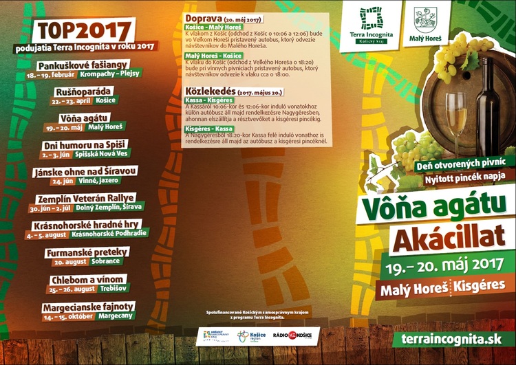 Vôňa agátu, ďalšie zo série Top podujatí programu Košického samosprávneho kraja Terra Incognita, začína v piatkový podvečer v Malom Horeši vo Vínnom dvore riadenou degustáciou 14 druhov vína z produkcie štyroch miestnych vinárov. „Degustovať sa bude napríklad  Rizling vlašský, Rosé Zweigeltrebe, ale aj Furmint alebo Polyhos, prastará odroda, ktorá sa stala synonymom obce a dala názov aj tunajšiemu spolku vinárov a vinohradníkov,“ prezradil Csaba Furik, starosta obce. Po tejto ochutnávke sú všetci pozvaní na koštovanie vína celého sortimentu jednotlivých vinárov priamo do areálu pivníc.