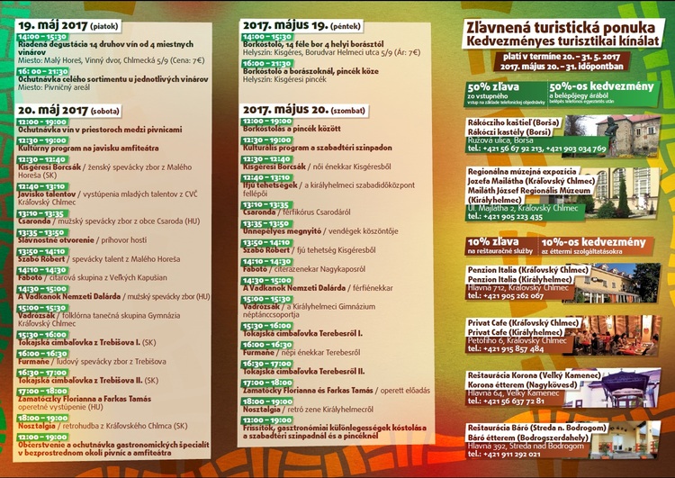 Pre návštevníkov je tiež pripravená ponuka zliav na turistické atrakcie a služby v blízkom okolí. Budú si môcť uplatniť 50-percentná zľava na vstupnom do Rákócziho kaštieľa v Borši a Regionálnej múzejnej expozície Jozefa Mailátha v Kráľovskom Chlmci alebo 10-percentnú zľavu na reštauračné služby vo vybraných reštauráciách v Medzibodroží. Tieto zľavy trvajú od 20. do 31. mája 2017.