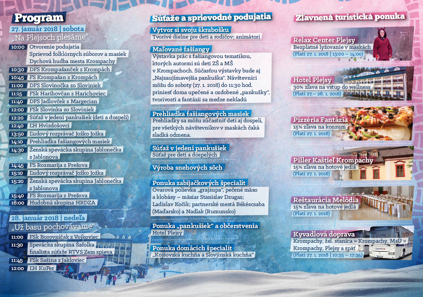 Fašiangové zvyky predvedú folkloristi zo Spiša, ale aj folklórny súbor Rozmarija z Prešova. Snehové bloky sa vďaka žiakom a študentom z Krompách zmenia na snehové sochy a príjemným prekvapením bude vystúpenie speváckej skupiny Šafolka, finalistu súťaže RTVS Zem spieva. „Svojich priaznivcov poteší aj hudobná skupina Hrdza. Autorské piesne inšpirované slovenským folklórom s prvkami folku, rocku a vplyvom world music ukončia sobotňajšie plesanie na Plejsoch,“ upresňuje program Lenka Vargová Jurková, výkonná riaditeľka Košice Región Turizmus. Unavení návštevníci budú môcť využiť 30-percentnú zľavu na vstup do wellness Hotela Plejsy.