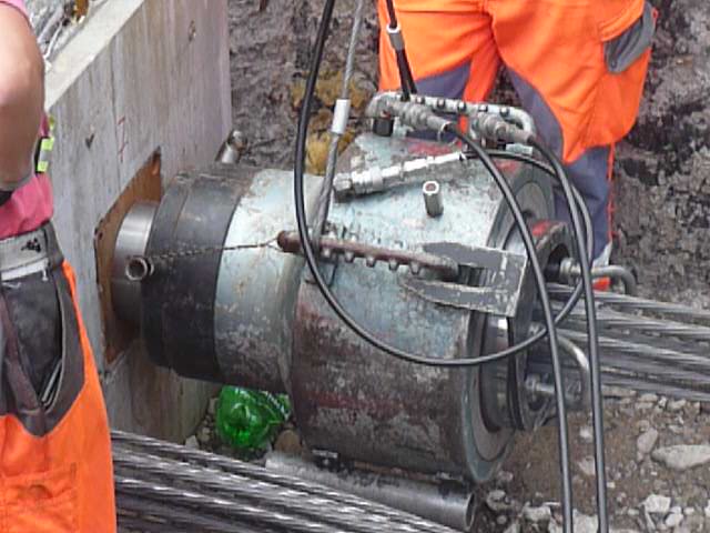 Na obidvoch stranách mosta sú po štyri otvory, v ktorých sú v chráničkách umiestnené oceľové káble. Po dva prostredné vo vodorovnom smere a po dva vonkajšie prechádzajúce cez deviátory. Každý z týchto ôsmich zväzkov tvorí 15 lán, každé jedno lano sa skladá zo siedmich oceľových prameňov. Po premeraní parametrov príde na rad ešte betónová injektáž v chráničkách.