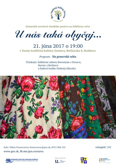 Folklórne večery majú stále miesto v bohatej palete aktivít Gemerského osvetového strediska v Rožňave. Dramaturgia tohto cyklického podujatia je zameraná na prezentáciu zvykov a obyčají horného Gemera, ale aj zaujímavých osobností a kolektívov, ktoré sa venujú zachovávaniu ľudových piesní, tancov, tradícií a remesiel.