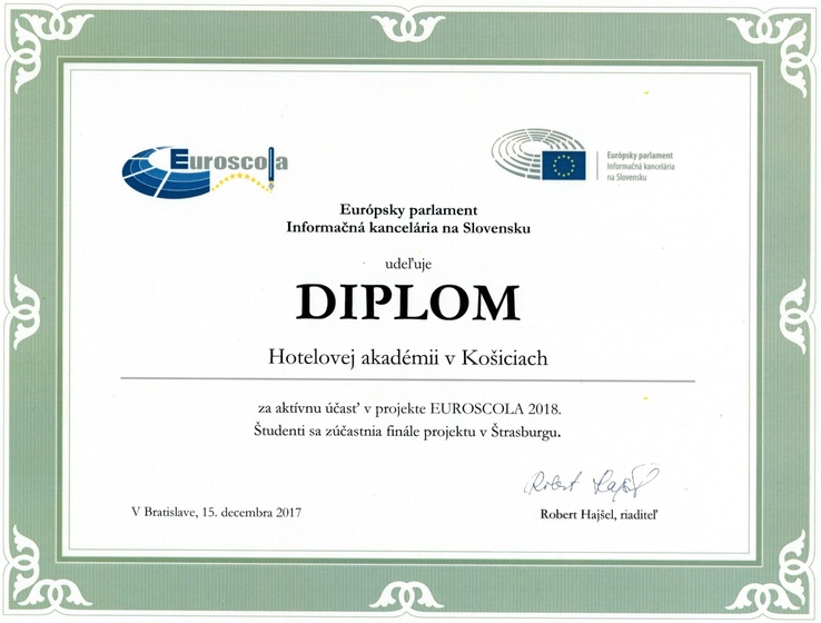 Informačná kancelária Európskeho parlamentu na Slovensku v polovici decembra vyhlásila výsledky súťaže Euroscola 2018. Hotelová akadémia z Košíc, ako jediná škola z Košického samosprávneho kraja, si prevzala diplom a cenu v podobe pobytu v Štrasburgu. Školu na vyhlásení výsledkov zastupovali Anna Zimanová, Mária Košková, Natália Antošková, Radka Cuníková a Viktória Andrejkovičová.