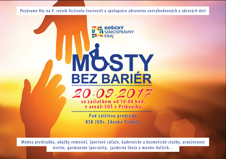 Festival tvorivosti a spolupráce zdravotne znevýhodnených a zdravých mladých ľudí bude v stredu 20. septembra 2017 od 10. hodiny v areáli Strednej odbornej školy v Pribeníku. Podujatie už po deviaty raz organizuje Košický samosprávny kraj v spolupráci so Strednou odbornou školou J. Majlátha v Pribeníku.
