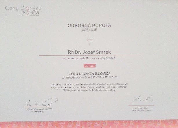 Cenu Dionýza Ilkoviča získal Jozef Smrek z Michaloviec. Na miestnom Gymnáziu Pavla Horova vyučuje fyziku a matematiku. Ocenenie získal za rozvoj mimoškolskej činnosti vo fyzike. Už desaťročia sa venuje talentovaným študentom, ktorí sa pod jeho vedením pripravujú na viaceré fyzikálne súťaže.