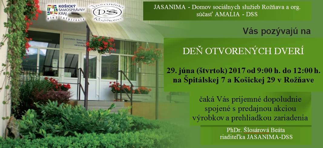 Už vo štvrtok 29. júna 2017 so začiatkom od 9:00 hod. sa v Domove sociálnych služieb Jasanima v Rožňave uskutoční Deň otvorených dverí na ktorom sa organizačne podieľa aj Domov sociálnych služieb Amalia (organizačná súčasť DSS Jasanima).