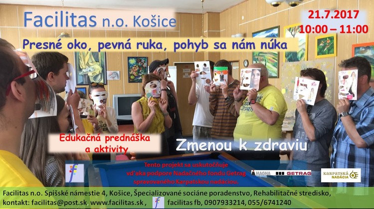 Rehabilitačné stredisko Facilitas n.o. dňa 21. júla 2017 organizuje v rámci projektu "Presné oko,pevná ruka, pohyb sa nám núka" edukačnú prednášku s názvom Zmenou k zdraviu. Daný projekt sa uskutočňuje vďaka podpore Nadačného fondu Getrag spravovaného Karpatskou nadáciou.