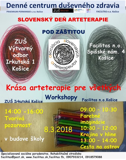 Nezisková organizácia Facilitas organizuje pri príležitosti Slovenského dňa arteterapie workshop Krása arteterapie pre všetkých, ktorý sa uskutoční 8. marca 2018 a poskytne priestor dozvedieť sa niečo viac o arteterapii a zažiť ju.