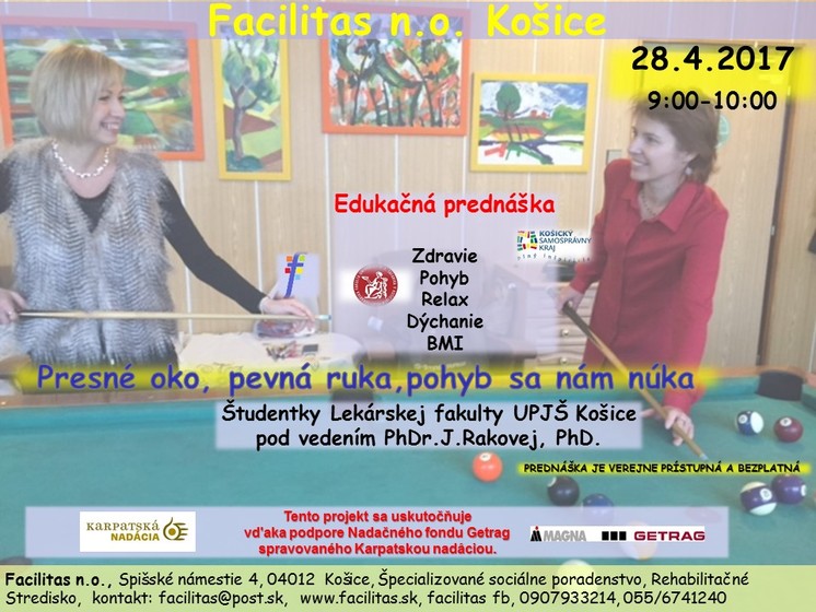 Dňa 28. 4. 2017 o 09:00 hod. sa vo Facilitas, n. o., krízovom a rehabilitačnom stredisku, poskytujúcom špecializované sociálne poradenstvo v oblasti duševného zdravia uskutoční edukačná prednáška pod názvom "Presné oko, pevná ruka, pohyb sa nám núka", ktorú budú odborne zastrešovať študentky Lekárskej fakulty UPJŠ v Košiciach pod vedením PhDr. J. Rakovej, PhD. Prednáška je verejne prístupná a bezplatná.