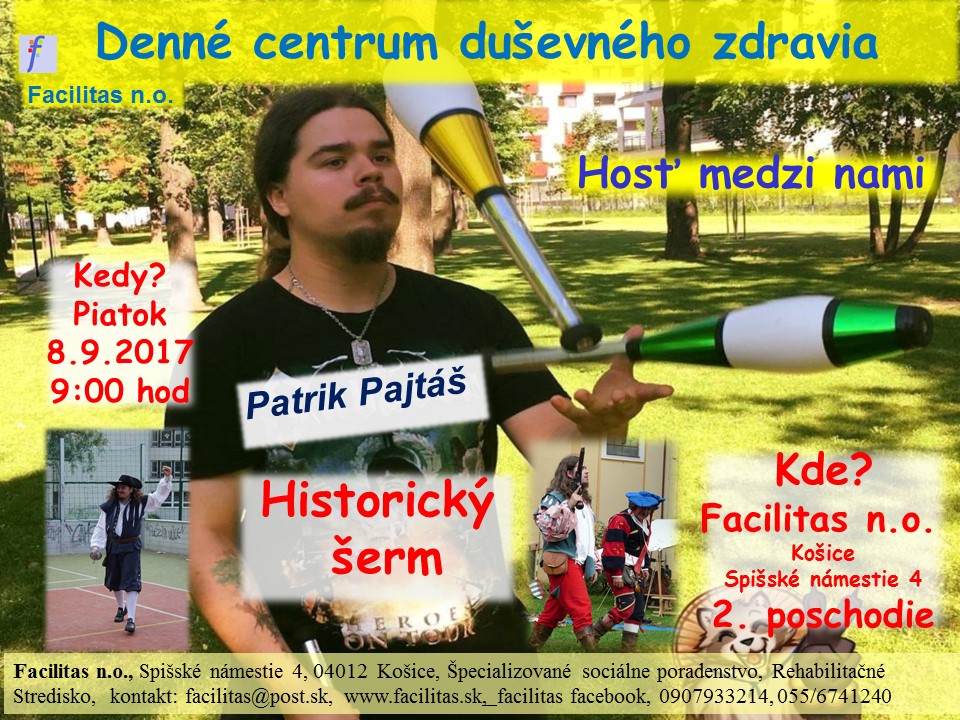 Denné centrum duševného zdravia Facilitas n.o. v piatok 8. septembra o 9:00 hod. pokračuje v usporadúvaní pravidelných cyklov prednášok a besied na rôzne odborné, ale predovšetkým užitočné témy Hosť medzi nami. Tentokrát pozvanie prijal Patrik Pajtáš, ktorý predstaví kúzlo historického šermu v autentickom dobovom kostýme. Podujatia Hosť medzi nami sú verejne prístupné a bezplatné.