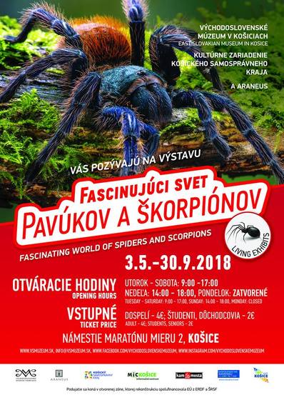 Východoslovenské múzeum v Košiciach v spolupráci s poľskou spoločnosťou ARANEUS pripravili pre širokú verejnosť unikátnu výstavu s názvom Fascinujúci svet pavúkov a škorpiónov. Po veľkom úspechu v roku 2016 v priestoroch Prírodovedného múzea Slovenského národného múzea v Bratislave prichádza táto výstava do Košíc. Návštevníci si ju budú môcť pozrieť od 3. mája do 30. septembra 2018 v historickej účelovej budove Východoslovenského múzea na Námestí Maratónu mieru 2.
