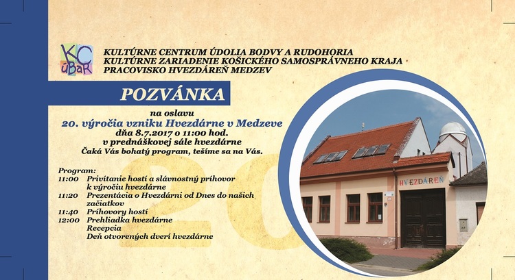 Hvezdáreň a planetárium v Medzeve, jediné zariadenie svojho druhu v okrese Košice – okolie, oslavuje dvadsať rokov existencie. Pri tejto príležitosti pripravilo v sobotu 8. júla 2017 bohatý program.