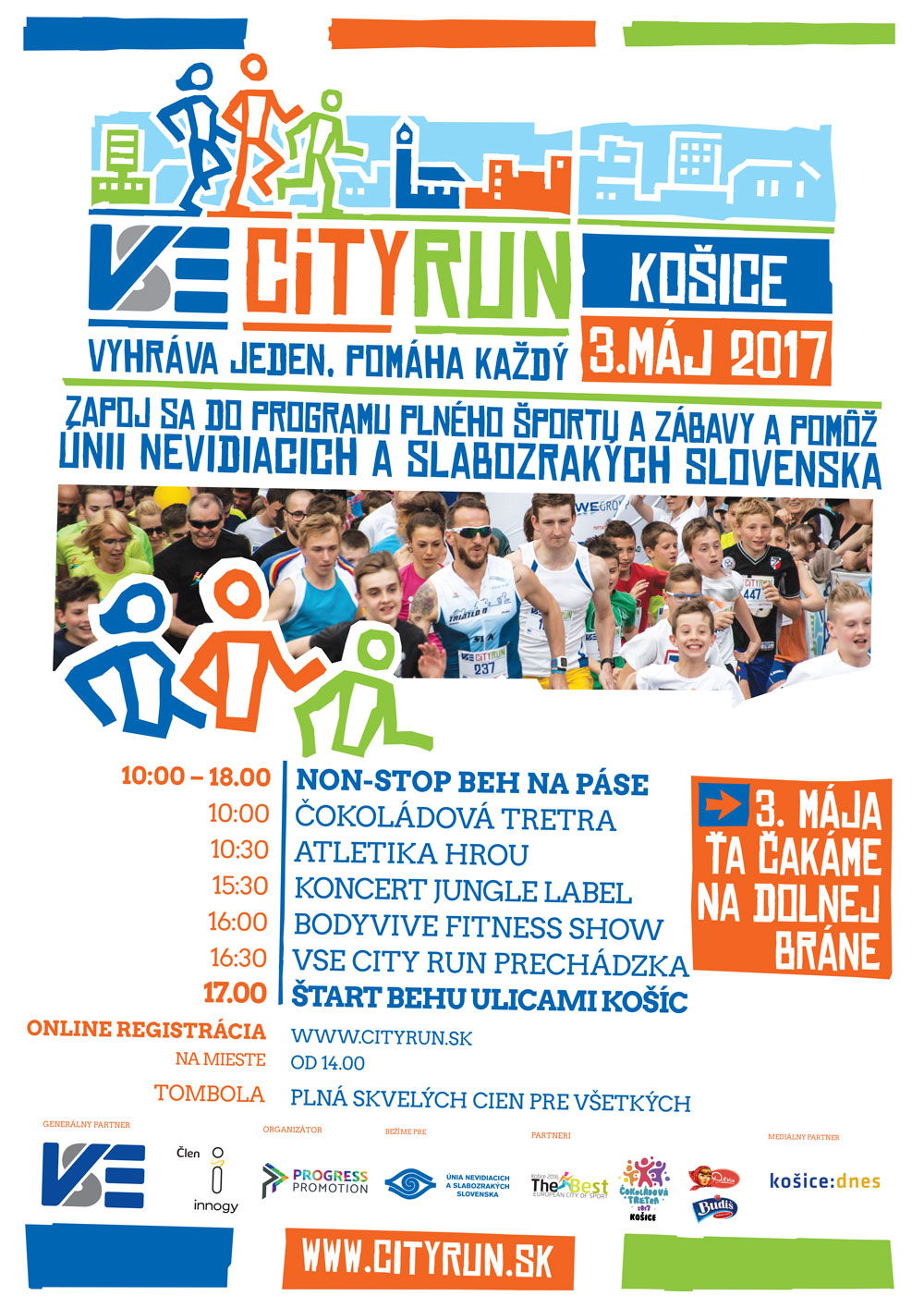 Originálny koncept charitatívnych behov v centrách miest východného Slovenska VSE CITY RUN odštartuje svoj jubilejný 10. ročník už 3. mája v uliciach Košíc a 11. mája v Prešove. Podujatie sa dnes radí medzi najväčšie charitatívno – športové na Slovensku a aktívne sa ho zúčastnilo už 26 775 bežcov v siedmich mestách. Do projektu sa každoročne zapájajú deti, seniori, amatérski športovci, športové kluby, študenti i známe osobnosti.