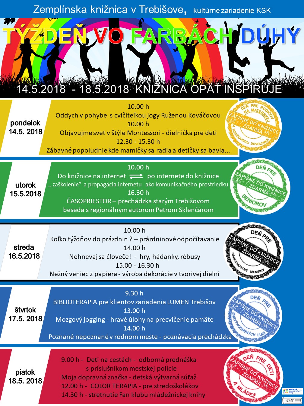 „Týždeň vo farbách dúhy – knižnica opäť inšpiruje“ - to je názov netradičného týždňa aktivít, ktoré pripravila Zemplínska knižnica v Trebišove pre svojich čitateľov, a to od pondelka 14. mája do piatka 18. mája 2018 vo svojich priestoroch.