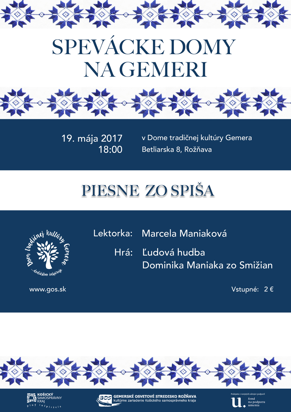 „Región Spiš, je podobne, ako náš Gemer, krásny a bohatý na rôznorodosť vo folklóre. Gemerské osvetové stredisko chce prostredníctvom speváckych domov priblížiť repertoár a spevácke štýly nielen z domáceho regiónu, ale aj z rôznych iných. Tentokrát naše pozvanie prijala vedúca detského súboru Šafolka pani Marcela Maniaková zo Smižan. Táto silná folklórna osobnosť zo Spiša je známa úspechmi, ktoré jej poctivou prácou získavajú deti spomínaného detského súboru. Svoj región, ale aj štýl práce a piesňový repertoár, príde predstaviť spolu s ľudovou hudbou jej syna Dominika Maniaka, ktorý súčasne primášuje aj v ľudovej hudbe folklórneho súboru Hornád v Košiciach,“ uvádza Mária Hlaváčová z Gemerského osvetového strediska v Rožňave.