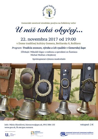 Folklórny večer na tému zvonkárstva v bývalej Gemerskej župe ponúkne ďalšie podujatie z cyklu U nás taká obyčaj v stredu 22. novembra od 19.hodiny. „Privítame vzácnych hostí zo Šumiaca, ale aj
