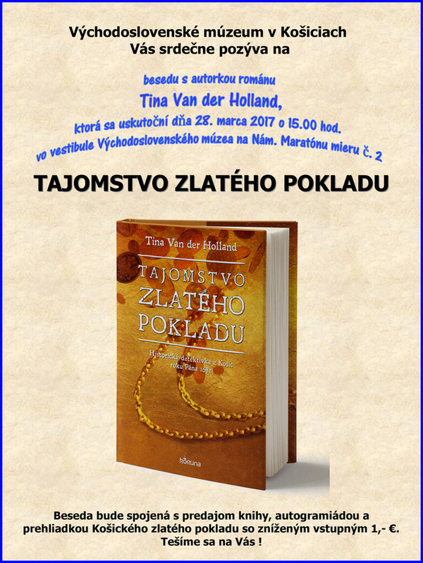 Východoslovenské múzeum v Košiciach pozýva na besedu s Tinou Van der Holland, autorkou knihy Tajomstvo zlatého pokladu. Bude v utorok 28. marca 2017 o 15. Hodine vo vestibule Východoslovenského múzea na Námestí Maratónu mieru 2 v Košiciach.